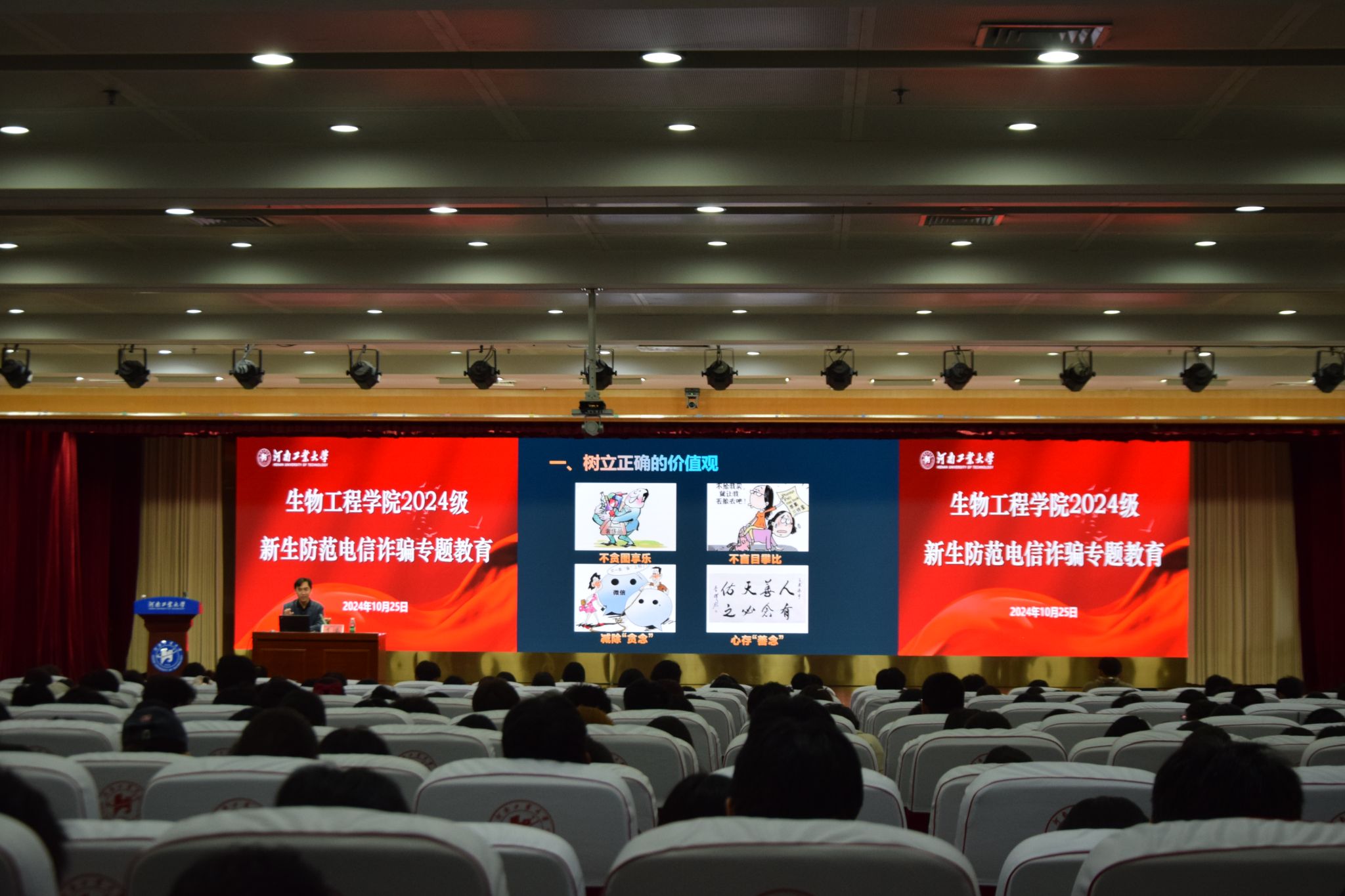于10月25日在学术报告中心D303报告厅举办防范电信诈骗专题教育讲座。本次讲座邀请校保卫处副处长李磊担任主讲嘉宾,学院党委副书记蔡永平及2024级全体学生参加活动。活动由学院2024级辅导员苏雪玲主持。
