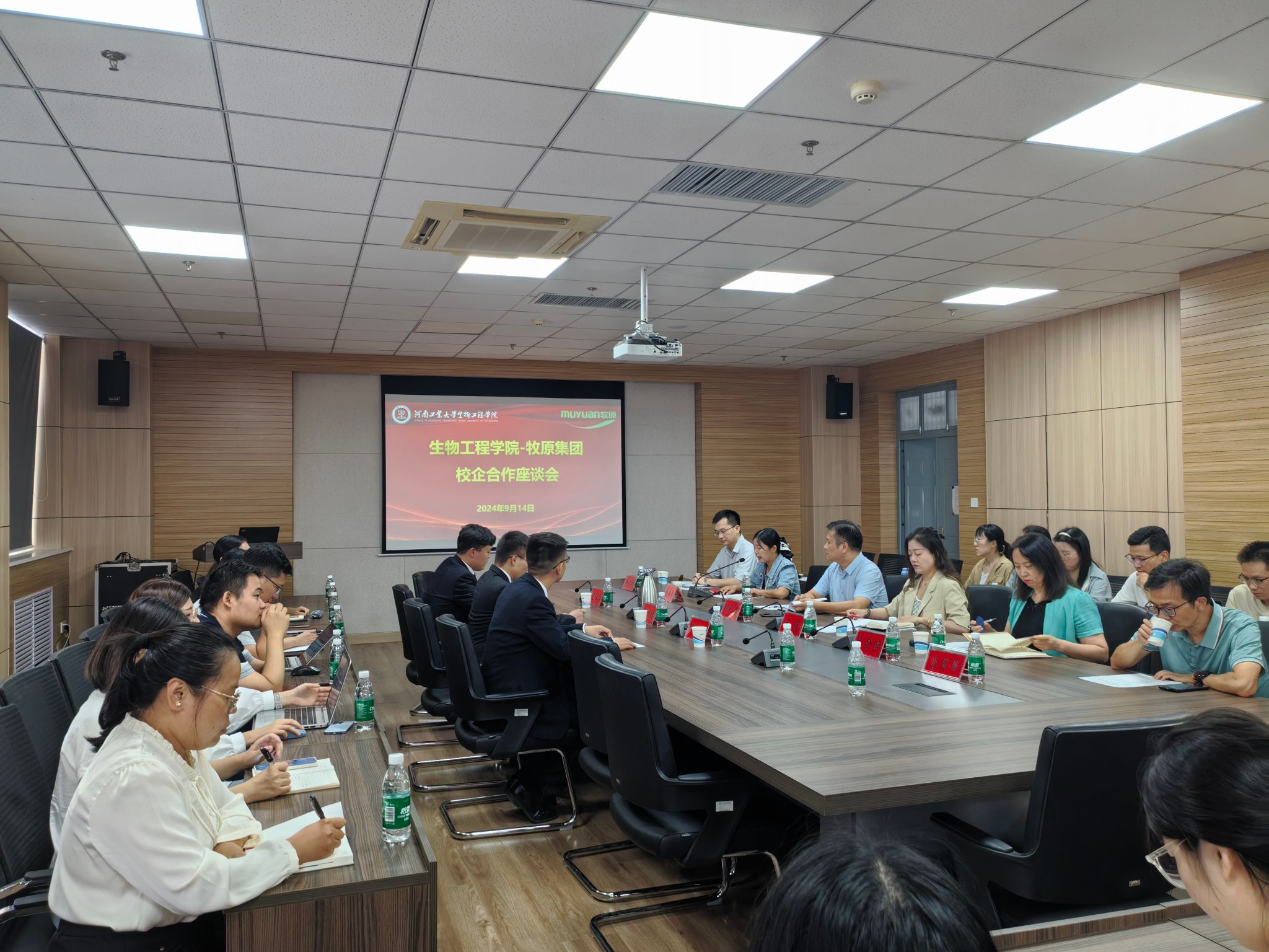 与牧原集团在惟德楼1313会议室举行校企合作座谈会。牧原集团饲料生产部负责人朱少朋、开封区域饲料生产负责人田松林、牧原集团招聘经理史明阳,学校就业创业中心副主任王萌,学院院长胡元森、动物科学系主任乔汉桢、相关教师及饲料工程专业学生代表参加会议。会议由学院党委副书记蔡永平主持。