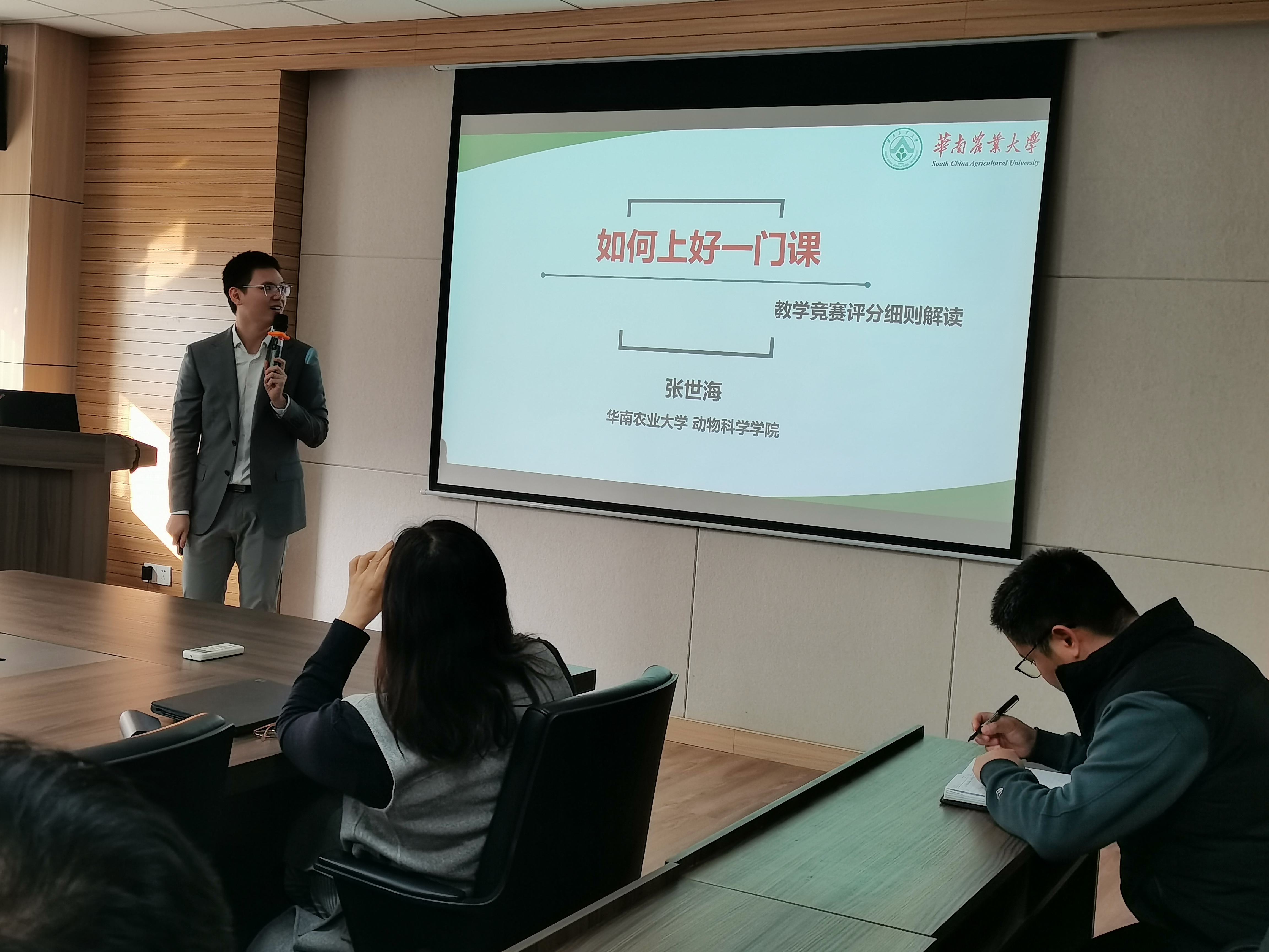 14日上午,张世海老师作了题为《如何上好一堂课》的辅导报告。他指出,一门好课要同时具备教学理念新颖、教学内容扎实、教学过程活跃和教学效果显著等四个特点,结合自已的教学体会,讲解了课程思政如何巧妙融入课堂。学院乔汉桢副教授选择动物科学专业核心课程《动物生理学》进行了研究性教学说课与授课展示,张世海进行了点评指导。