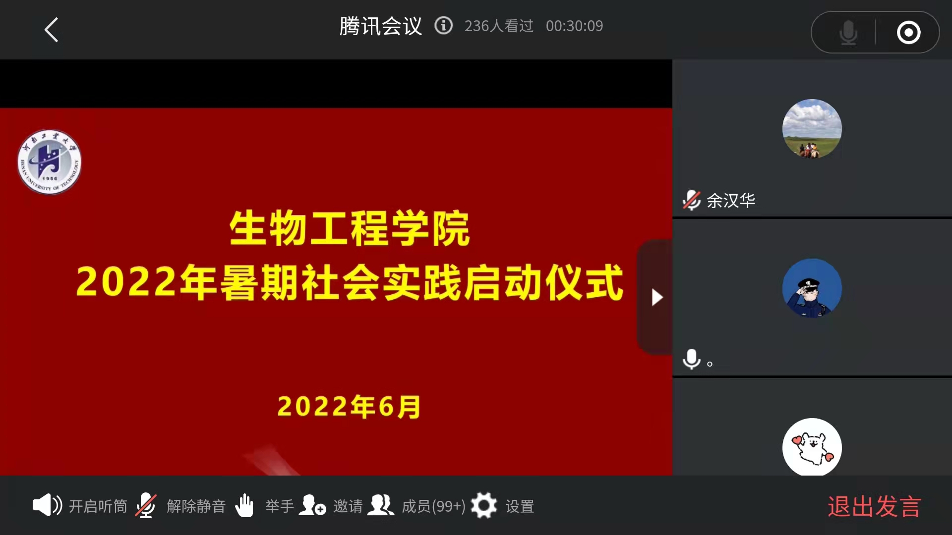 召开2022年暑期社会实践启动仪式暨动员培训会,会议采取腾讯会议的方式进行。学院党委副书记余汉华、团委负责人丁凯强、辅导员杨雨薇、学院学生会骨干成员及21级全体学生、20级学生代表参加会议。会议由周新宇同学主持。
