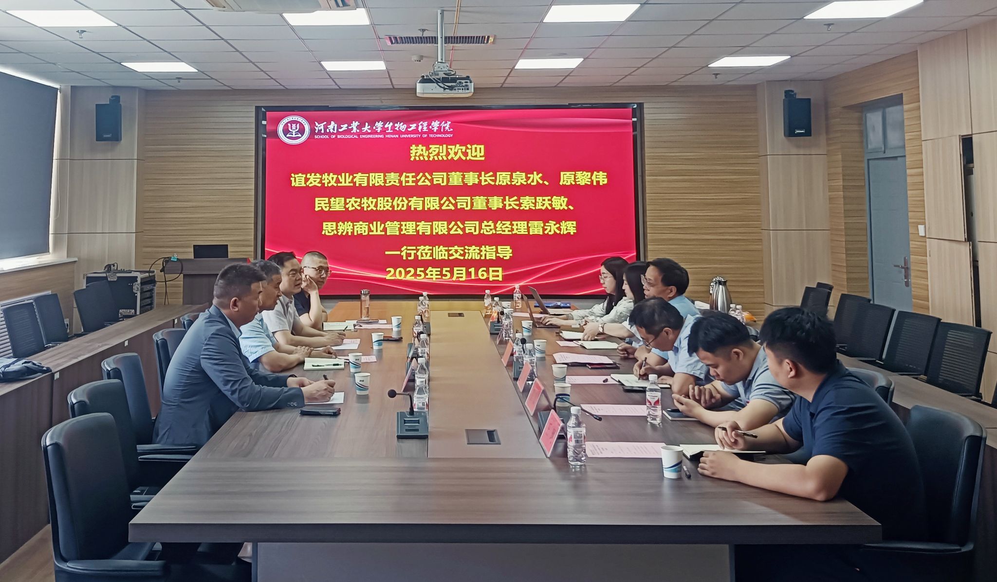 会上,卫红伟对原泉水、索跃敏等一行的到来表示热烈欢迎,介绍了学院的发展历程,重点就人才培养、师资队伍、专业优势等方面进行了讲解,希望校企四方能够依托各自优势资源,加强沟通交流,共同打造校企合作新模式,助推各自高质量发展。原泉水介绍了河南省谊发牧业有限责任公司的基本情况及企业对液态饲喂技术的需求。索跃敏介绍了河南民望农牧股份有限公司的基本情况,表达了对液态饲喂技术的认可和期待,希望能加快该技术在公司落地,解决企业面临的困境。张勇副教授介绍了团队依托平台、科研成果、成员组成、现有相关技术等。随后,四方在企业需求、科学研究等方面展开了深入交流和探讨。