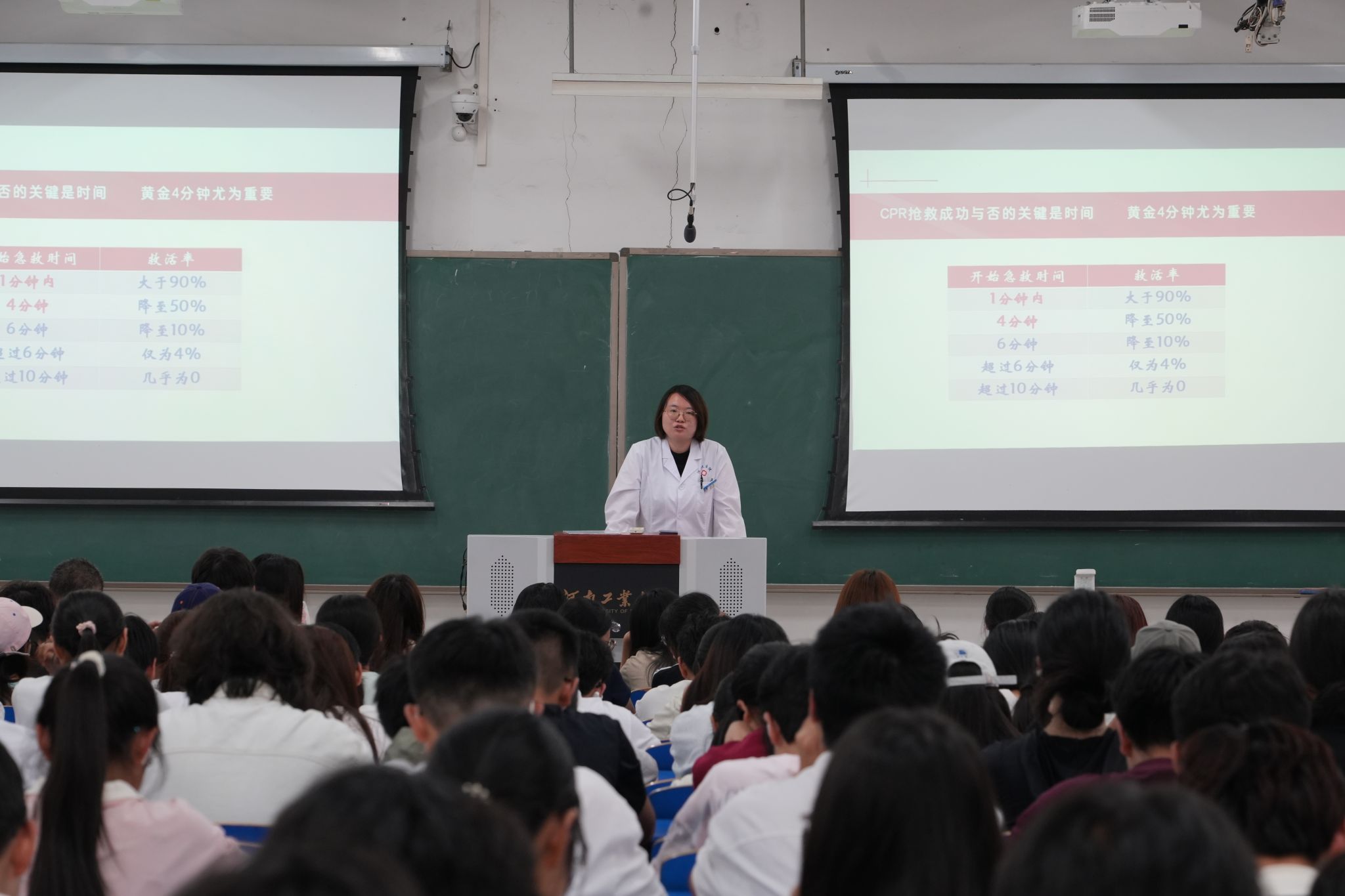 在文科组团楼101教室举办急救知识培训活动。校医院执业医师李蕾和护士长齐丽丽受邀主讲,学院2024级全体学生参加培训。