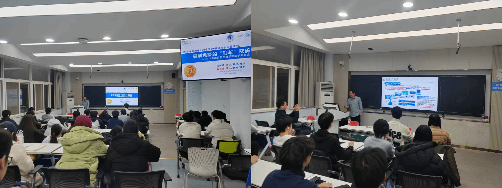 2025年12月4日晚,生物工程学院特邀西北农林科技大学动物科技学院蓝贤勇教授,为饲料工程专业本科生做题为《破解免疫的“刹车”密码—2025年诺贝尔生理学或医学奖解读》的科普报告。本次报告由动物科学系主任乔汉桢副教授主持。2024、2025级的饲料工程专业本科生及系青年骨干教师张雪蕾、张封东博士共同参与了报告,师生齐聚一堂,共同聆听前沿科学解读,彰显了我系对本科生科研启蒙与创新能力培养的持续重视。