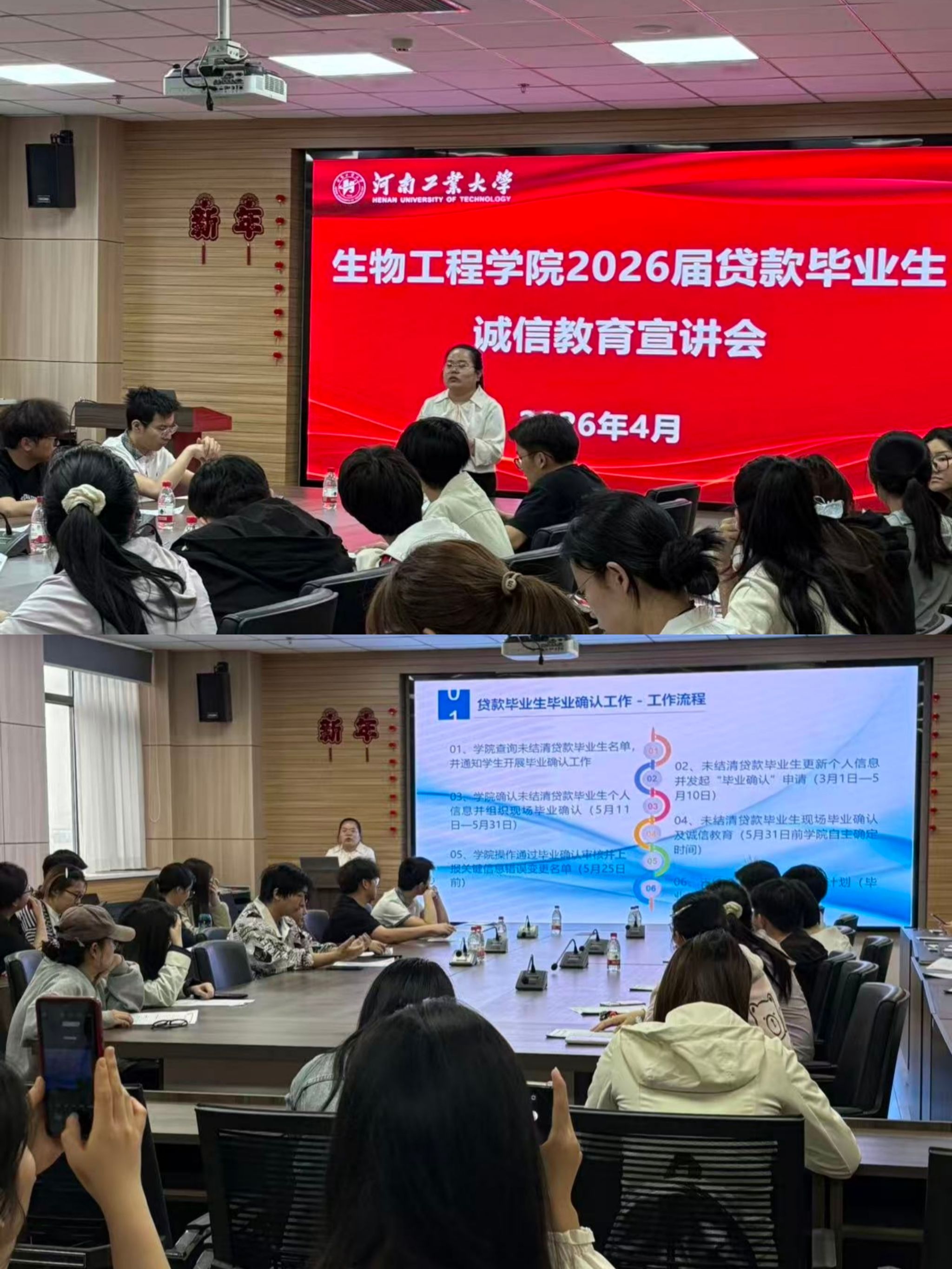 会上,苏雪玲首先传达了学校资助管理中心关于2026届贷款毕业生贷后管理工作的指导精神,整体通报了本届贷款毕业生各阶段的工作安排。她结合实际操作流程,详细解读了毕业确认申请的办理步骤、个人信息的更新维护方式、提前还款的方式及支付宝平台的具体操作指引,并向参会学生逐一发放了纸质版《河南工业大学2026届贷款毕业生温馨提示》。在互动交流环节,苏雪玲围绕学生普遍关注的还款计划变更、贷款展期办理、征信记录影响等问题进行了耐心细致地现场答疑。她着重强调了诚信还款对毕业生未来就业、住房贷款、个人征信等长远发展的关键支撑作用,提醒同学们诚信既是个人成长发展的道德基石,也是融入社会的基本准则。在警示教育部分,她结合个别违约学生因失信而遭遇的信贷受阻、职业受限及法律追责等具体案例,直观揭示了失信行为带来的现实代价与潜在影响,引导毕业生从思想深处筑牢诚信还贷的意识防线。
