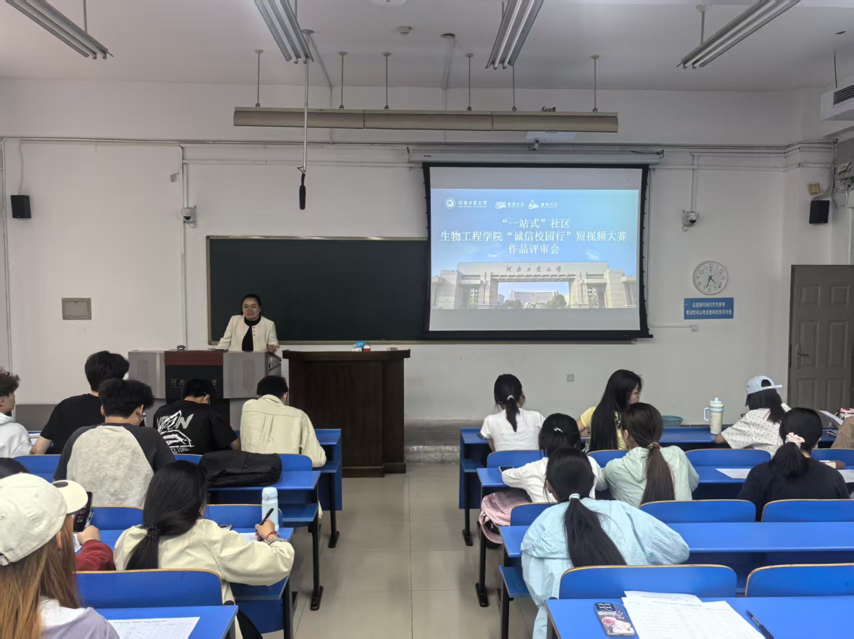 会议伊始,苏雪玲首先对活动中涌现出的精彩文章和优秀作者给予了肯定,表扬了学生们紧扣资助政策宣传、防诈骗警示、感恩励志教育、考试诚信、学术诚信等内容,用镜头展现了新时代大学生诚实守信、自立自强的精神风貌,鼓励受助学生及广大青年以镜头为笔,记录身边的诚信故事。在评审环节,由师生代表组成的评审团成员从主题契合度、思想教育性、艺术表现力以及原创性四大维度出发,对每一部作品的视频画面、配音配乐、剧情逻辑及政策导向进行了细致的评审。最终选出9个优秀短视频作品推荐参加校赛。