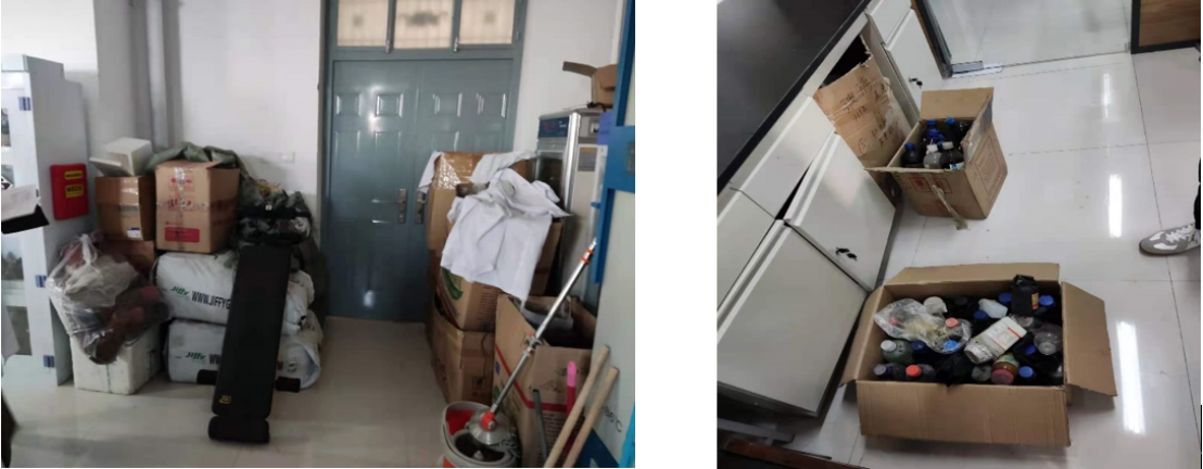 1. 1413-1 实验室西段设备杂物堆积、试剂堆放在地上未入试剂柜。