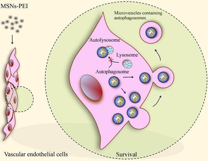 与未修饰的MSNs、氨基修饰的MSNs或脂质体包裹的MSNs不同,100 μg/ml聚乙烯亚胺修饰的MSNs(MSNs-PEI)对人脐静脉内皮细胞无明显毒性。然而,MSNs-PEI阻断自噬小体与溶酶体的融合,诱导自噬小体积聚,这是许多纳米颗粒毒性的核心机制。据此,研究者预测在血管内皮细胞中存在一种自噬小体清除的替代途径来减轻MSNs-PEI诱导的自噬应激。进一步研究发现,MSNs-PEI诱导细胞骨架结构改变,但不引起内质网应激,当MSNs-PEI阻断自噬小体降解时,积累的自噬小体通过微泡释放到细胞外空间。阻断自噬小体的形成或释放会导致受损线粒体堆积和活性氧的过量产生,进而导致血管内皮细胞死亡。该研究在国际上首次证实当纳米颗粒阻断了自噬小体降解时,细胞产生一种缓解自噬压力的补偿机制,即通过微体介导自噬小体释放到胞外,维持血管内皮细胞稳态。因此,促进积累自噬小体的释放可能是对抗纳米颗粒血管毒性的一种新的保护策略。
