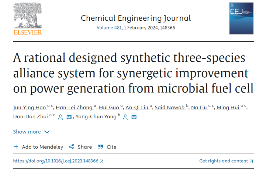 翟丹丹副教授课题组在国际著名学术期刊《Chemical Engineering Journal》(影响因子IF=15.1,中科院1区,化学-工程领域TOP期刊)在线发表了题为“A rational designed synthetic three-species alliance system for synergetic improvement on power generation from microbial fuel cell ”的研究论文,我校为该论文的第一署名单位,小说阅读网