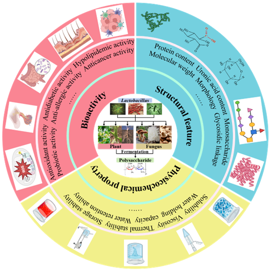 多糖是一种由10分子以上单糖通过糖苷键连接而成的高分子聚合物,不仅绿色安全,还具有抗肿瘤、抗癌、抗炎、免疫调节、降血糖、降血脂、抗氧化、抗辐射、抑菌等多种生物活性,在食品、医药及工农业生产等领域展现出广阔的应用前景。然而,多糖的生物活性往往较低,无法满足现实中生产生活的需求。通过对多糖进行改性以提高或者赋予多糖更加优异的理化特性和生物活性,进而提升和拓展多糖的应用,已逐渐得到学者们的关注和认可。除物理、化学、酶法等之外,微生物发酵也是一种对多糖进行改性的优良方法,并且微生物发酵具有绿色环保、效率高、易于大规模生产等特点。因此,本文选择具有益生活性的乳杆菌为对象,系统综述乳杆菌发酵对植物和真菌胞外多糖结构特征、理化特性、生物活性的影响,为多糖的微生物发酵改性以及发酵功能乳品和饮料的开发提供参考与帮助。